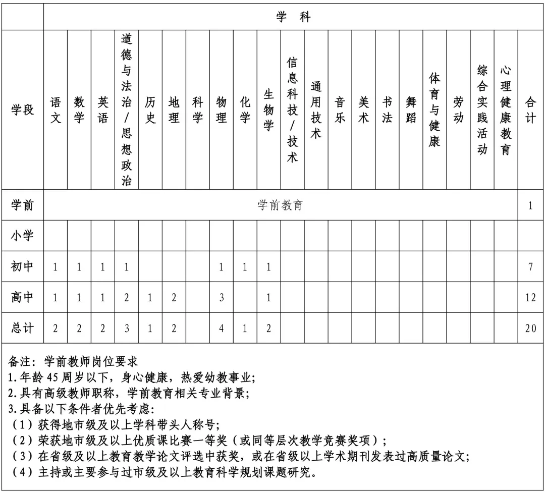 在职教师,年龄在35周岁以下;具有硕士研究生以上学历学位的,或具有中级以上职称的,年龄放宽到40周岁;特别优秀的,且具有副高级以上职称的,年龄可放宽到45周岁。符合《宣城市教育人才引进和培养实施办法》(宣办发〔2024〕12号)全职人才引进分类标准,年龄按其规定执行。