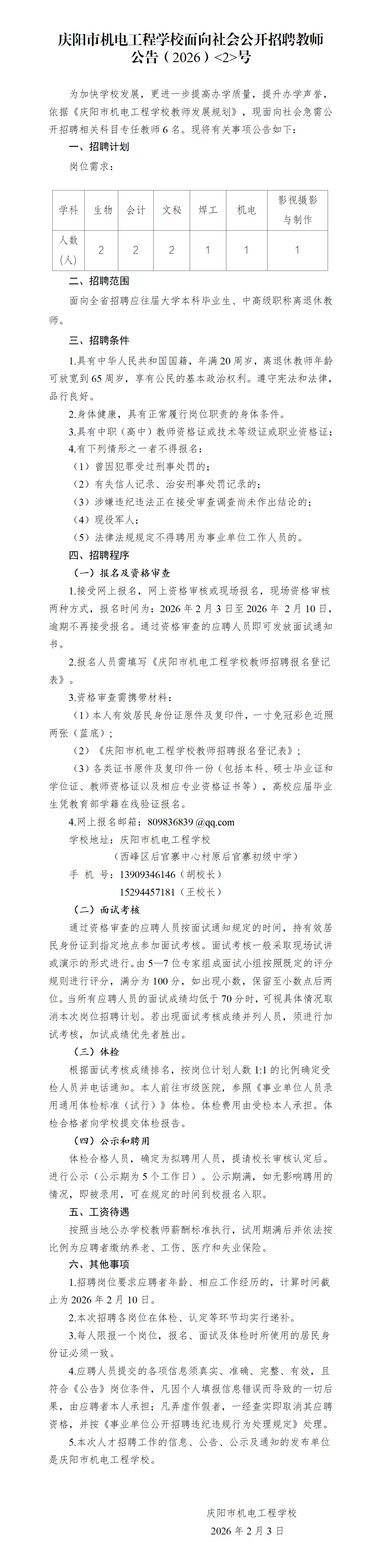 2026年庆阳市机电工程学校面向社会招聘教师公告(6名)