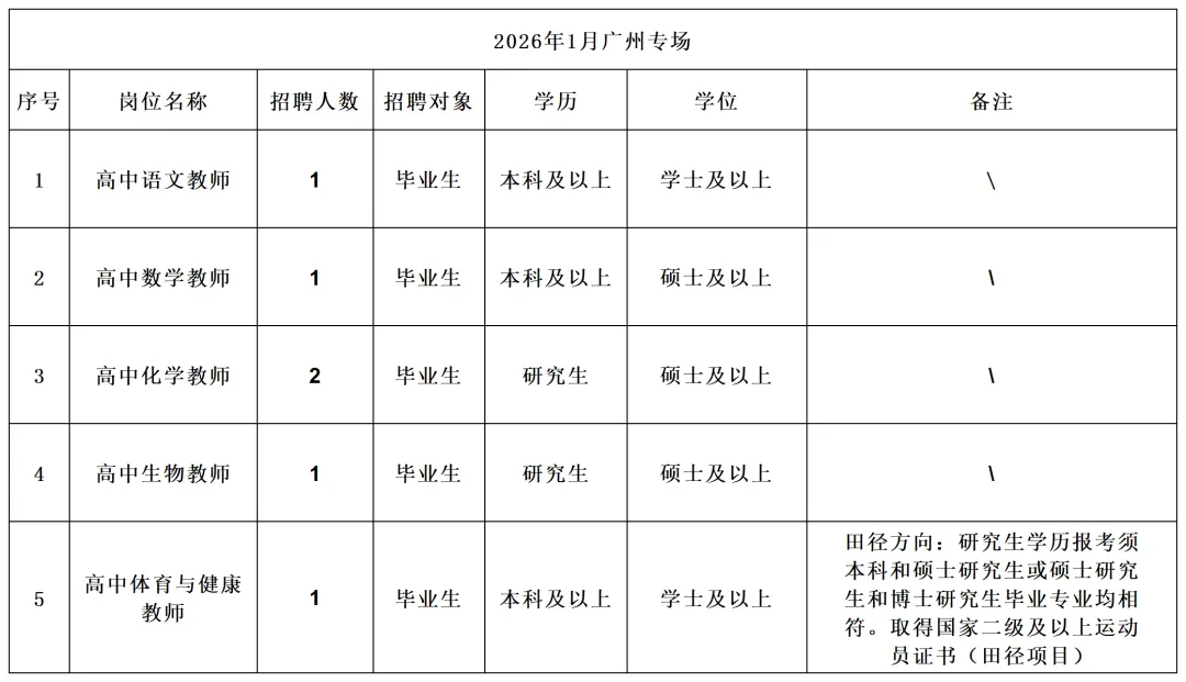 1.“百万英才汇南粤”东莞实验中学2026年1月公开招聘事业编制教师广州专场岗位表