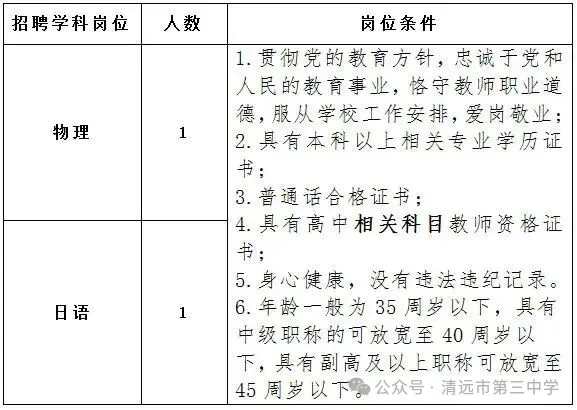 清远市第三中学是清远市教育局直属公办高级中学。因学校发展需要,现面向社会公开招聘临聘物理、日语教师各1名。现将有关事项公布如下: