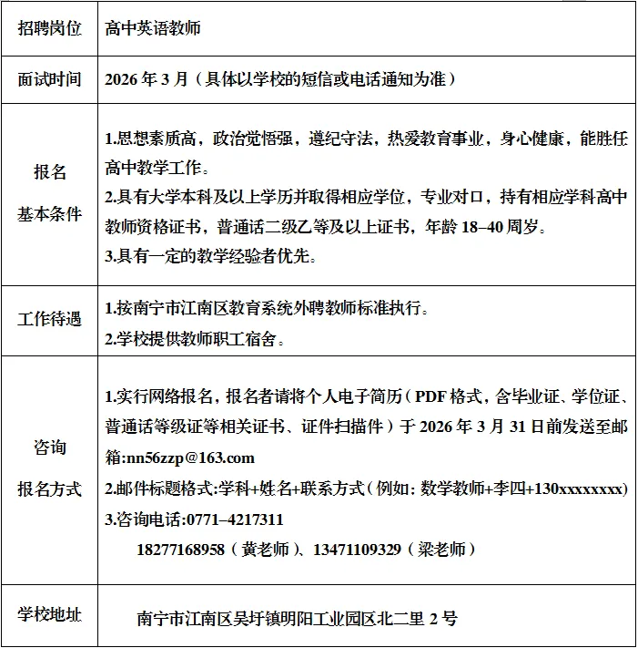 2026年南宁市第五十六中学春季学期编外教师招聘公告(第二批)