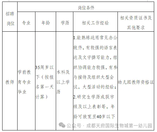 2025年成都天府国际生物城第一幼儿园教职工招聘公告(1人)