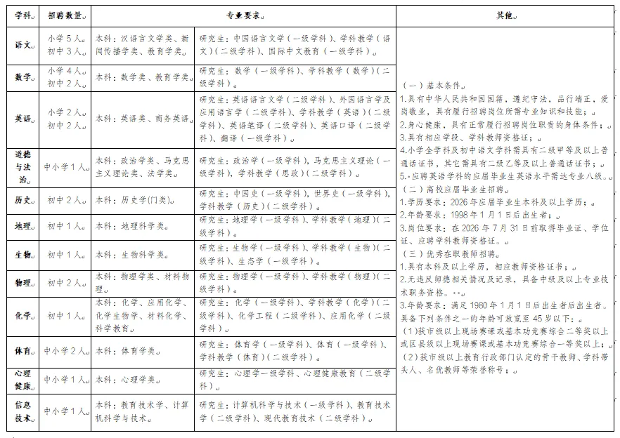 (3)岗位要求:在2026年7月31日前取得毕业证、学位证、应聘学科教师资格证。